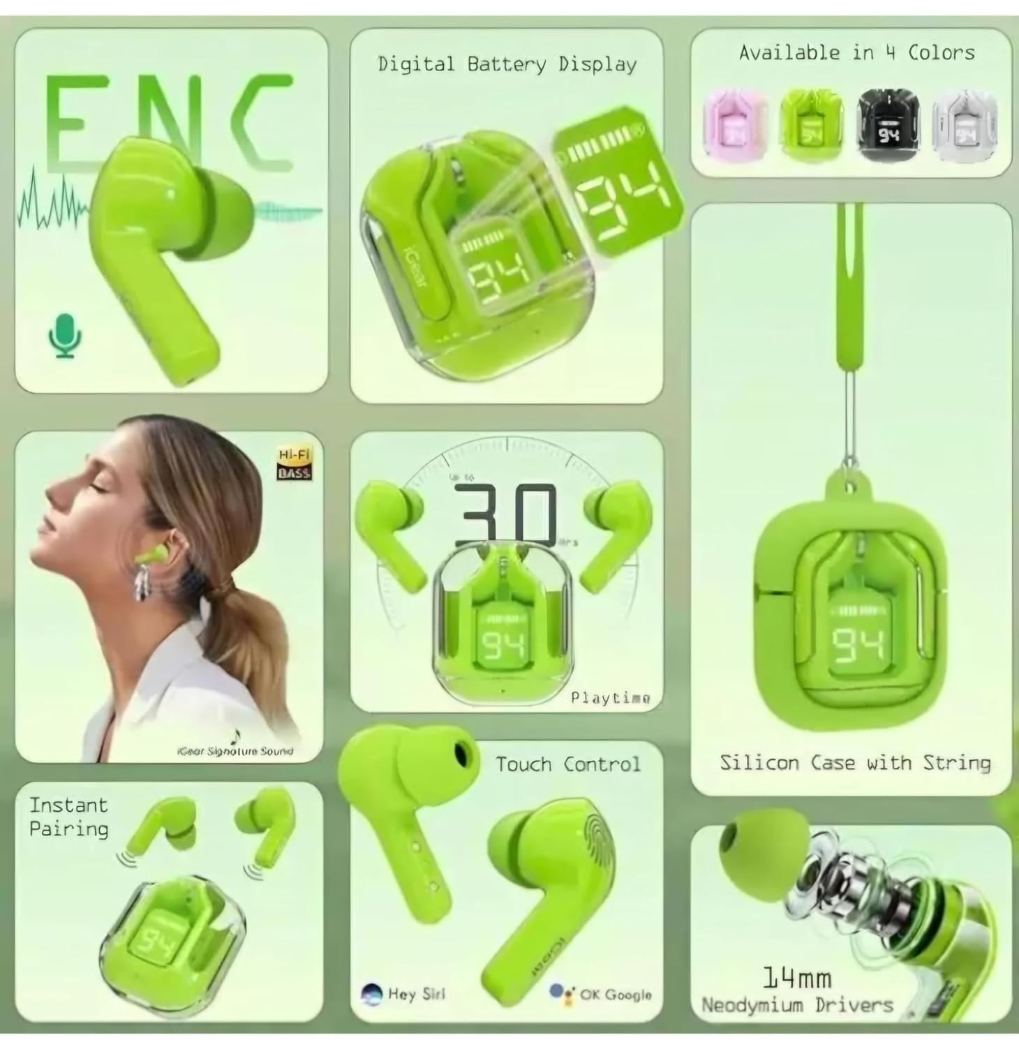 - [LED Digital Display & Colorful Design] Accurate LED display of the power of charging case and both earbuds, allowing you to know the power status of the wireless earbuds and charging case at any time. This series of Bluetooth earphones with translucent charging case, futuristic texture, 5 different colors. The waterproof earbuds can effectively prevent splash damage caused by sweat and raindrops.